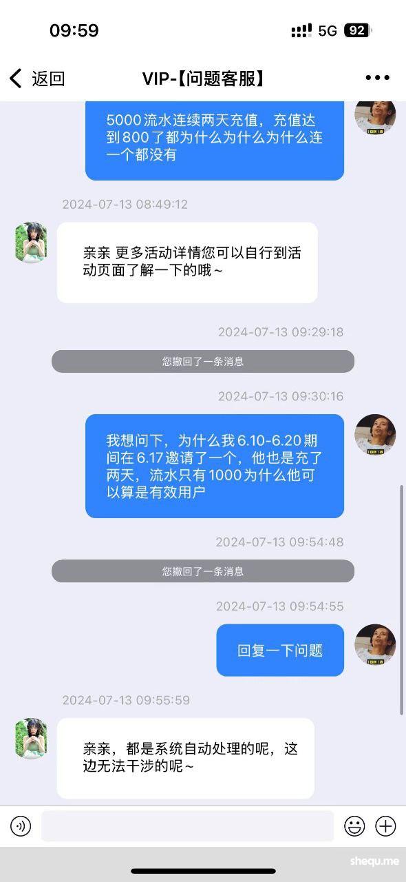 南宫黑人头费我在南宫邀请了15个有效新用户,大部分都是7号和8号9号邀请的,都有连续两天充值,并且达到了500以上,有效流水大部分都有2000以上有些5000,到现在结算的时候说我的是一次性用户,系统不给我发放礼金,全部给我黑了,一共22500元,我在6.10-6.20期间的17号也拉了一个人,他在18号充值和19号充值,总共流水1000,他的情况和我上面15个人的情况一模一样,但是他发放了礼金,到了另一个周期,我拉了15个人,现在却是以各种理由不给我发放礼金,大家看清南宫,不要去南宫拉人了,你拉人拉的多不会给你礼金发放的