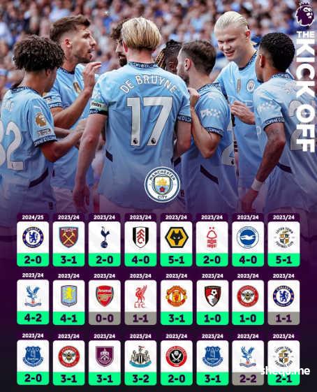 英超第1轮第三比赛日完赛2场:焦点战曼城客场2-0切尔西,伦敦德比布伦特福德2-1水晶宫。开局伊始,前英超冠军违反FFP将被扣除2分。