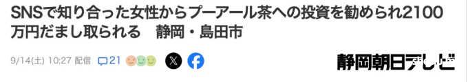 同样也是在今年5月中旬,静冈县有男性受害者被相同的卖茶女诈骗了2100多万日元。